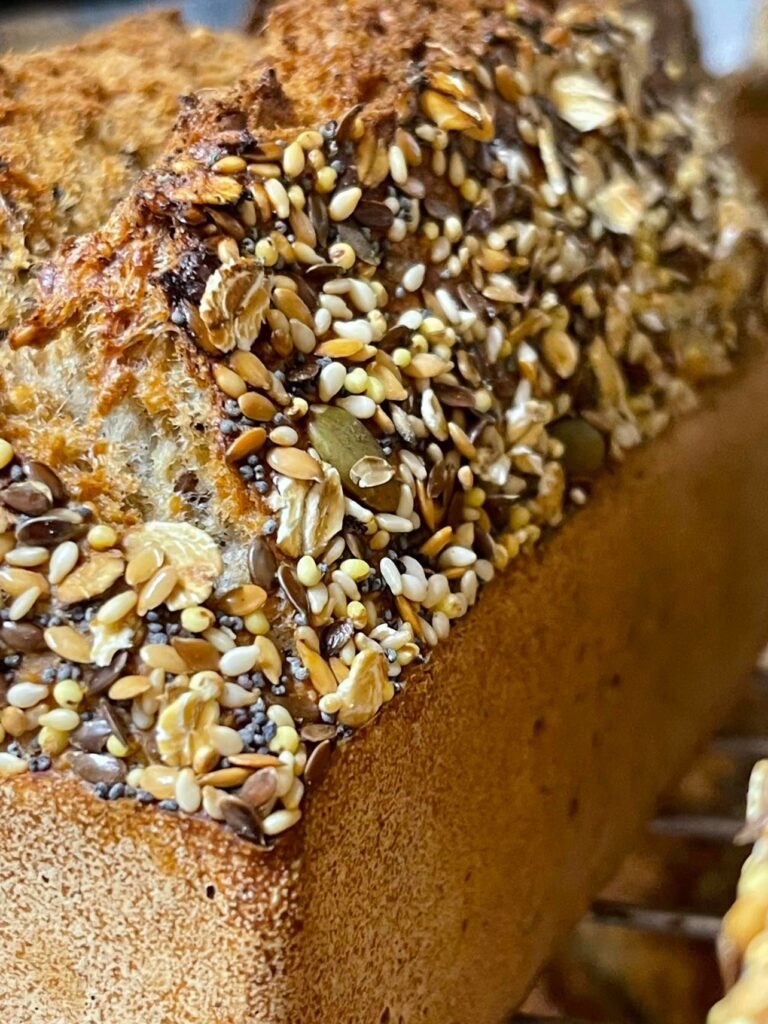 Très faible en gluten, le pain nordique a une mie dense et une croûte très croquante avec ses différentes graines (lin brin, lin jaune, sésames, pavot, millet, flocon d’avoine, graine de courge).
